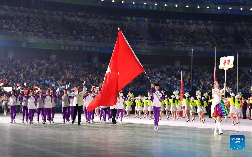 Members of Hong Kong Special Administrative Region Delegation parade into the stadium during the opening ceremony for China's 14th National Games in Xi'an, Shaanxi Province, Sept. 15, 2021. (Xinhua/Zhang Bowen)