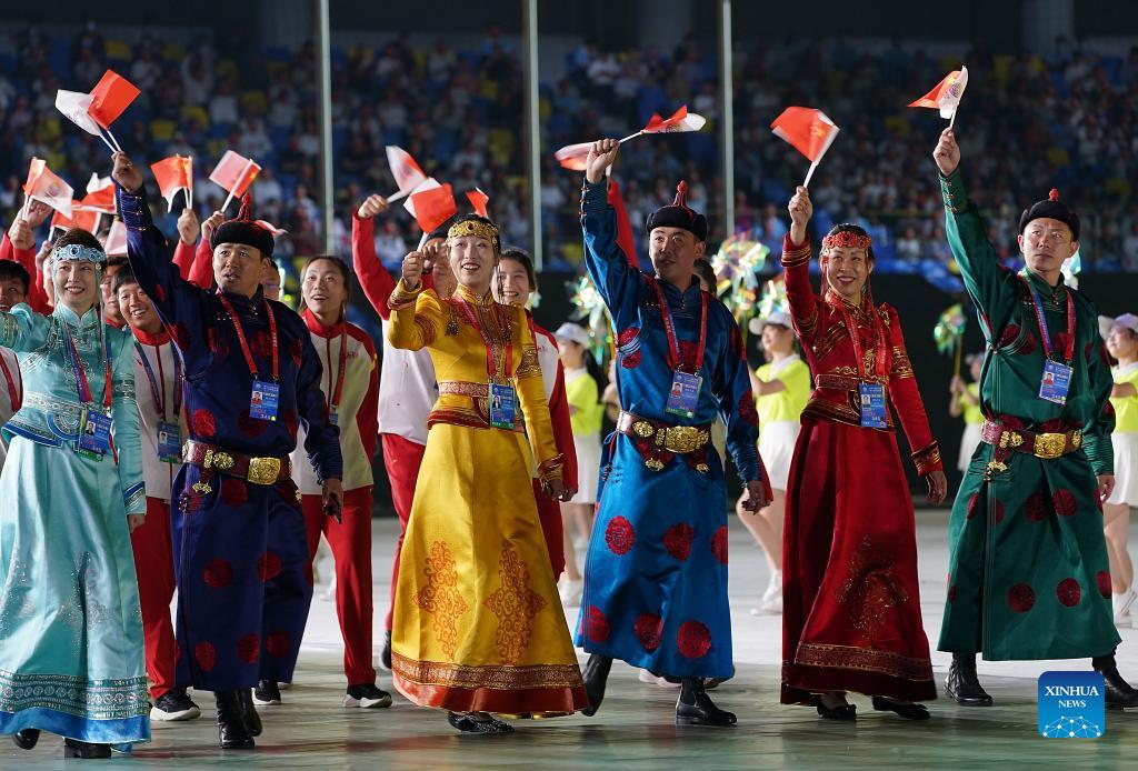 Members of Inner Mongolia Autonomous Region Delegation parade into the stadium during the opening ceremony for China's 14th National Games in Xi'an, Shaanxi Province, Sept. 15, 2021. (Xinhua/Peng Ziyang)