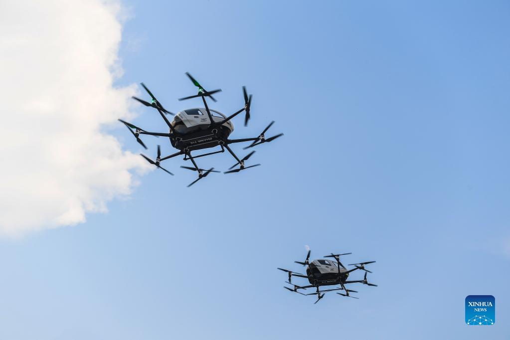 Two passenger-grade autonomous aerial vehicles (AAV) from EHang, a leading AAV technology platform company, take demo flights in an integrated airspace in Shenzhen, south China's Guangdong Province, Sept. 15, 2021. EHang and HELI-EASTERN held a joint press conference Wednesday on building a pilot project focusing on integrated airspace for urban air mobility operations in the Guangdong-Hong Kong-Macao Greater Bay Area. (Xinhua/Mao Siqian)