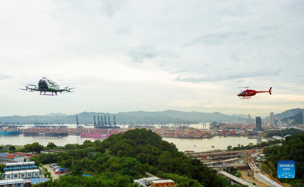 Aerial photo taken on Sept. 14, 2021 shows the demo flights of a Bell 206 helicopter (R) from HELI-EASTERN, a low-altitude general aviation carrier and helicopter service provider, and a passenger-grade autonomous aerial vehicle (AAV) from EHang, a leading AAV technology platform company, in an integrated airspace in Shenzhen, south China's Guangdong Province. EHang and HELI-EASTERN held a joint press conference Wednesday on building a pilot project focusing on integrated airspace for urban air mobility operations in the Guangdong-Hong Kong-Macao Greater Bay Area. (Xinhua)