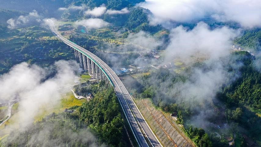 Photo taken on August 6, 2021 shows an expressway bridge in Tonggu township, Youyang Tujia and Miao autonomous county, southwest China’s Chongqing municipality. (People’s Daily Online/He Yi)