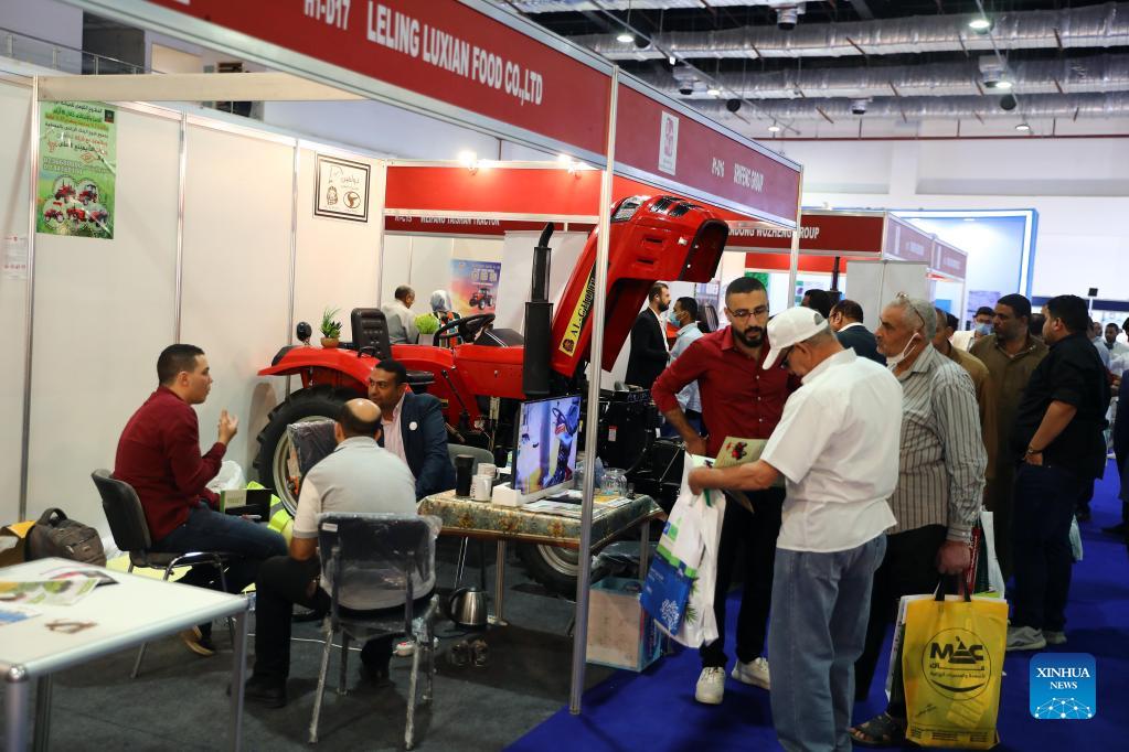 People visit a booth of Chinese company Shandong Shifeng Group Co., Ltd featuring agricultural tractors during the International Agricultural Exhibition for Africa and the Middle East in Cairo, Egypt, on Sept. 13, 2021. Egyptian-Chinese business partners presenting a variety of agricultural products and machinery stood out among exhibitors at the 33rd edition of Egypt's largest annual expo Sahara, the International Agricultural Exhibition for Africa and the Middle East. (Xinhua/Ahmed Gomaa)