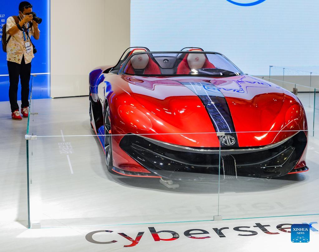A visitor takes photo of an vehicle at the 2021 World New Energy Vehicle Congress (WNEVC) in Haikou, capital of south China's Hainan Province, Sept. 15, 2021. The 2021 WNEVC kicked off on Wednesday in Haikou, focusing on the new energy vehicle industry under the background of carbon neutrality. Themed "Comprehensively promoting marketization, accelerating cross-industry integration, jointly achieving carbon neutrality," the three-day event will feature several summits, forums, exhibitions and other activities. (Xinhua/Zhou Jiayi)