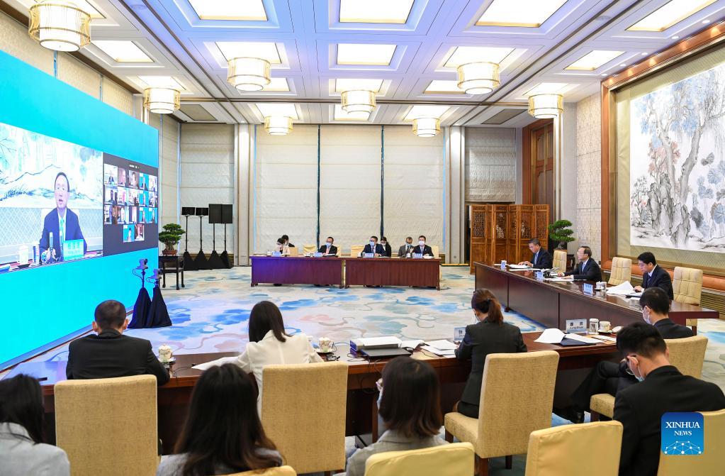 Yang Jiechi, a member of the Political Bureau of the Central Committee of the Communist Party of China (CPC), also director of the Office of the Foreign Affairs Commission of the CPC Central Committee, meets via video link with representatives of the U.S. Democratic and Republican parties who attend the 12th China-U.S. Political Party Leaders Dialogue in Beijing, capital of China, Sept. 15, 2021. (Xinhua/Yin Bogu)