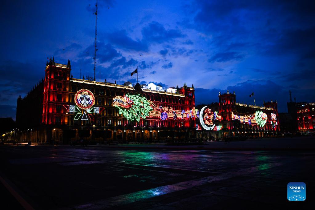 Photo taken on Sept. 15, 2021 shows a view of the Zocalo Square before the upcoming celebrations of the Mexican Independence Day, in Mexico City, capital of Mexico. (Xinhua/Xin Yuewei)