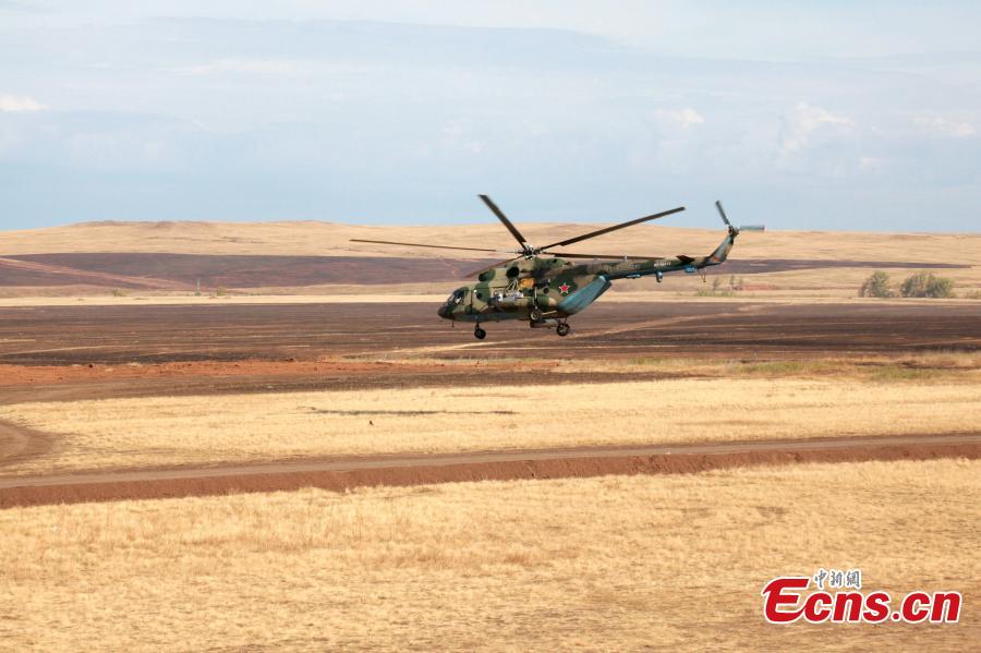 A foreign helicopter flies during the live-fire coordinated training session of the "Peace Mission 2021" in Orenburg, Russia, Sept. 15, 2021. (Photo: China News Service/Li Chun)