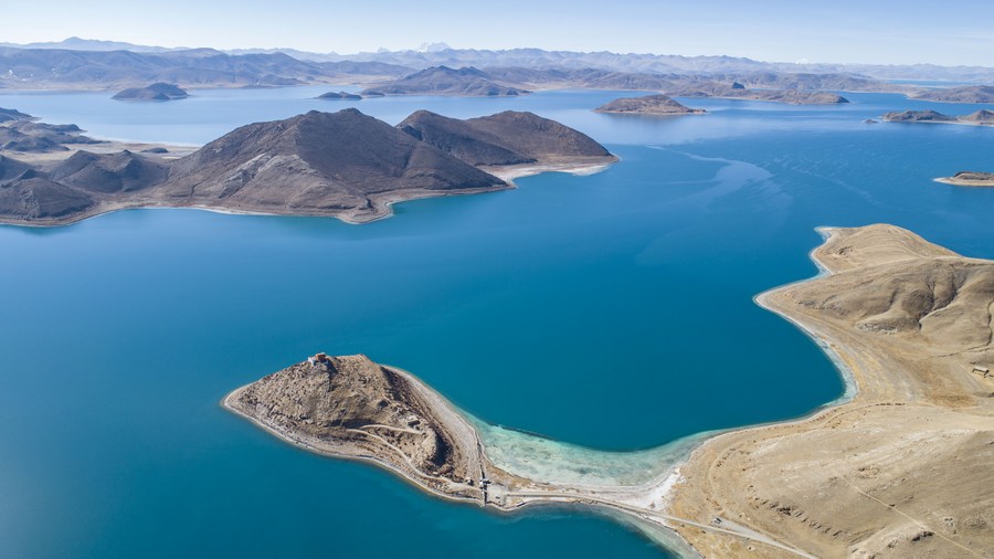 Aerial photo taken on Jan. 10, 2021 shows the scenery of Yamzbog Yumco Lake in Shannan, southwest China's Tibet Autonomous Region. (Xinhua/Sun Fei)