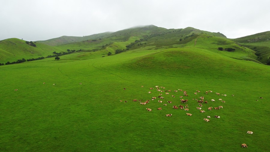 Aerial photo taken on July 26, 2021 shows a herd of cattle on the Wulanmaodu pasture in Horqin Right Wing Front Banner, Hinggan League, north China's Inner Mongolia Autonomous Region. (Xinhua/Bei He)