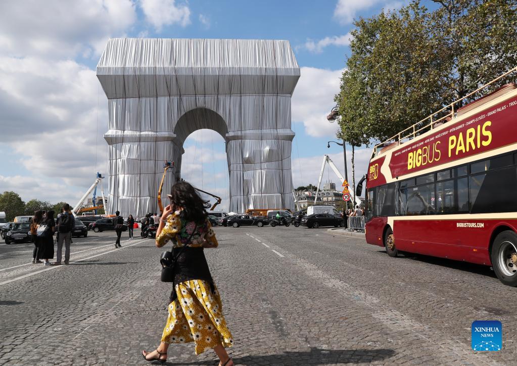 PARIS, Sept. 16 (Xinhua) -- The entire Arc de Triomphe at the top of the Champs-Elysees in Paris is to stay wrapped in fabric for two weeks, an art installation conceived by the late artist Christo and inaugurated on Thursday by French President Emmanuel Macron.