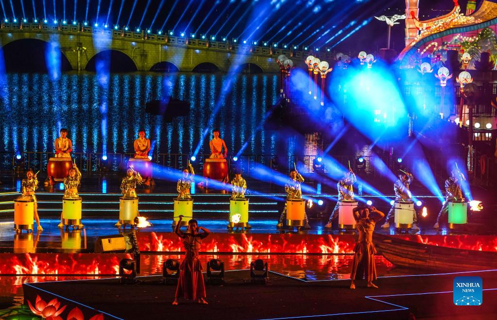 People perform during the opening ceremony of a lantern fair celebrating the Mid-Autumn Festival in Zhouzhuang Township of Kunshan City, east China's Jiangsu Province, Sept. 16, 2021. (Xinhua/Yang Lei)
