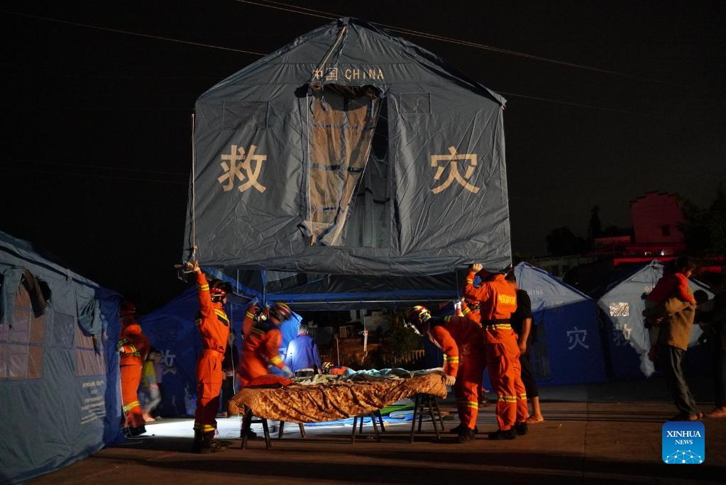 Rescuers build temporary shelters for affected residents in Longhua Village of Fuji Town, Luxian County, southwest China's Sichuan Province, Sept. 16, 2021. Three people were confirmed dead and 88 others were sent to hospital after a 6.0-magnitude earthquake jolted Luxian County in the city of Luzhou, in southwest China's Sichuan Province. China Earthquake Administration has dispatched a work team to guide on-site disaster-relief work. A total of 890 commanders and fighters from nearby fire-fighting and rescue brigades have been mobilized, while another 4,600 rescue workers are on standby. (Photo by Qiu Weihong/Xinhua)