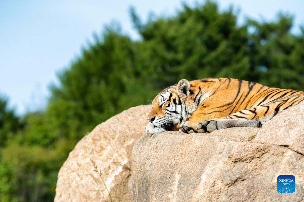 A Siberian tiger takes a nap on a rock at a forest park under the China Hengdaohezi Feline Breeding Center in northeast China's Heilongjiang Province, Sept. 15, 2021. (Xinhua/Xie Jianfei)