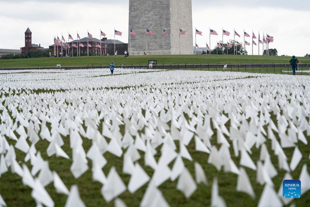 White flags are seen on the National Mall in Washington, D.C., the United States, on Sept. 16, 2021. More than 660,000 white flags were installed here to honor the lives lost to COVID-19 in the United States. (Xinhua/Liu Jie)