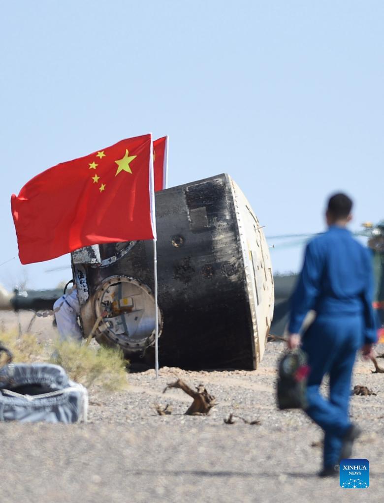 The return capsule of the Shenzhou-12 manned spaceship lands successfully at the Dongfeng landing site in north China's Inner Mongolia Autonomous Region on Sept. 17, 2021. (Xinhua/Ren Junchuan)
