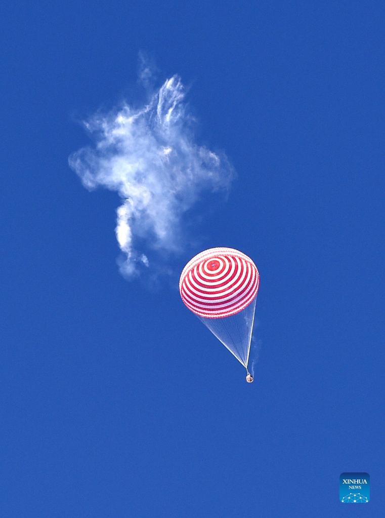 The return capsule of the Shenzhou-12 manned spaceship is about to land at the Dongfeng landing site in north China's Inner Mongolia Autonomous Region on Sept. 17, 2021. (Xinhua/Ren Junchuan)