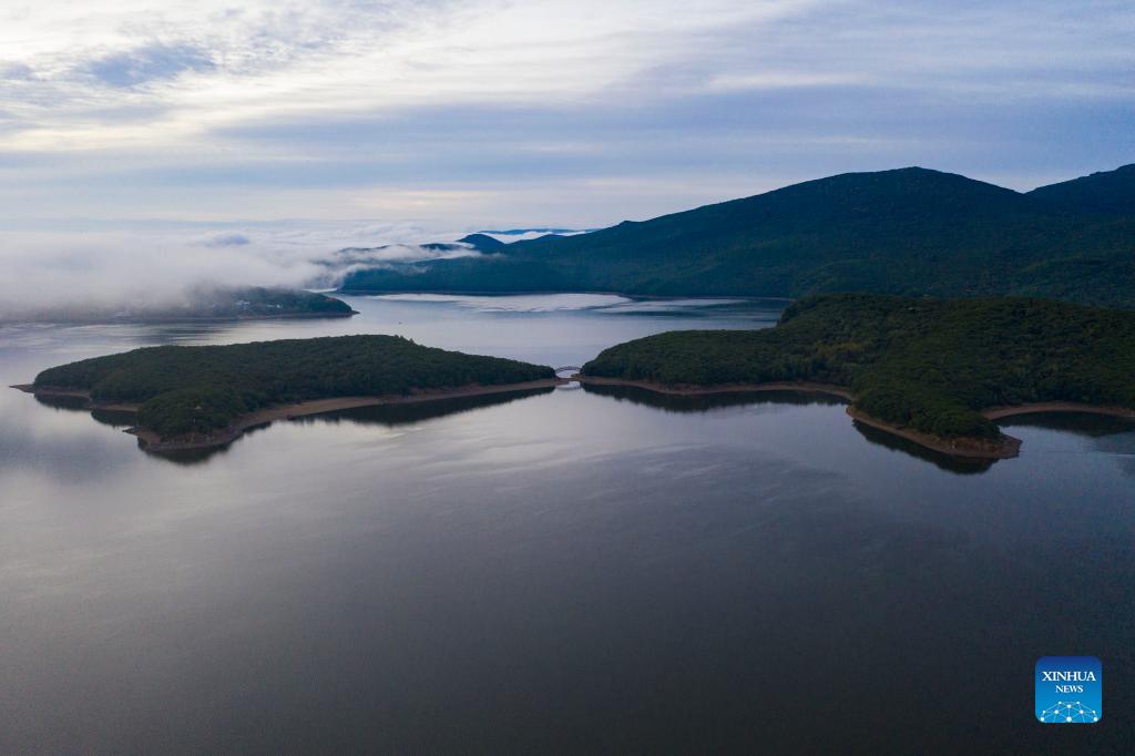 Aerial photo taken on Sept. 17, 2021 shows a view of the Jingpohu Global Geopark at dawn in Mudanjiang, northeast China's Heilongjiang Province. (Xinhua/Xie Jianfei)
