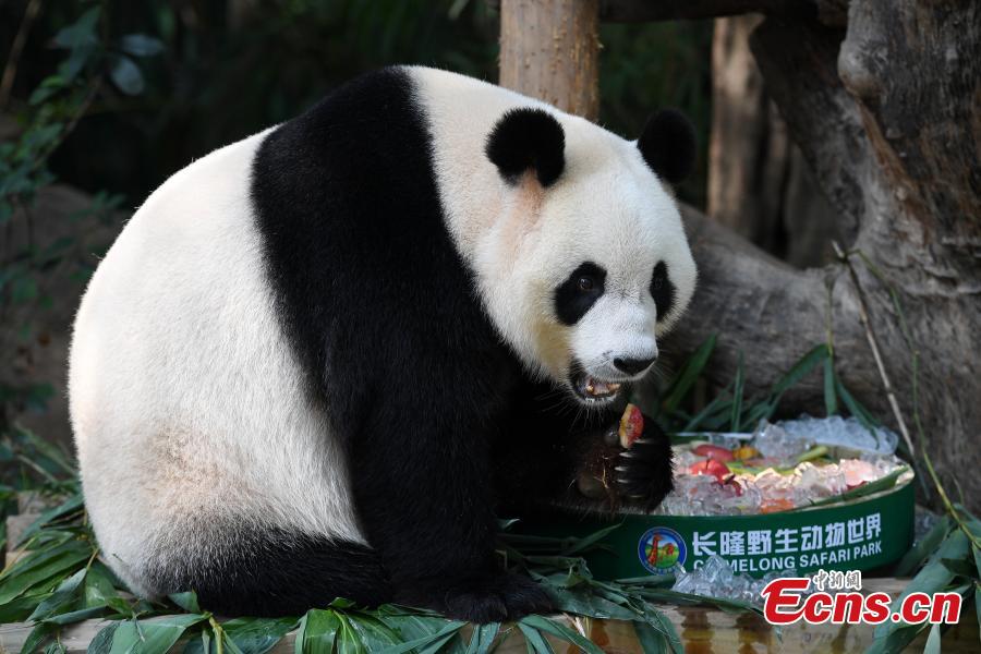 Mengmeng eats specially-made ice mooncakes at Chimelong Safari Park in Guangzhou, September 16, 2021. (Photo: China News Service/Chen Chuhong)
