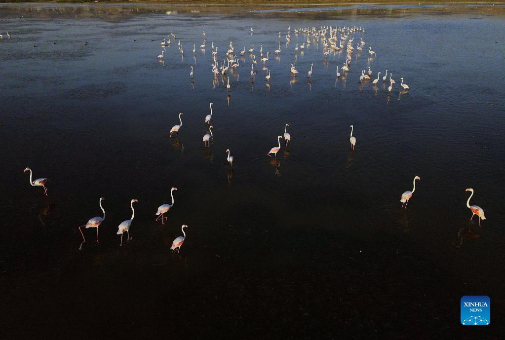 Aerial photo taken on Sept. 17, 2021 shows flamingos in Mogan Lake in Ankara, Turkey. (Photo by Mustafa Kaya/Xinhua)