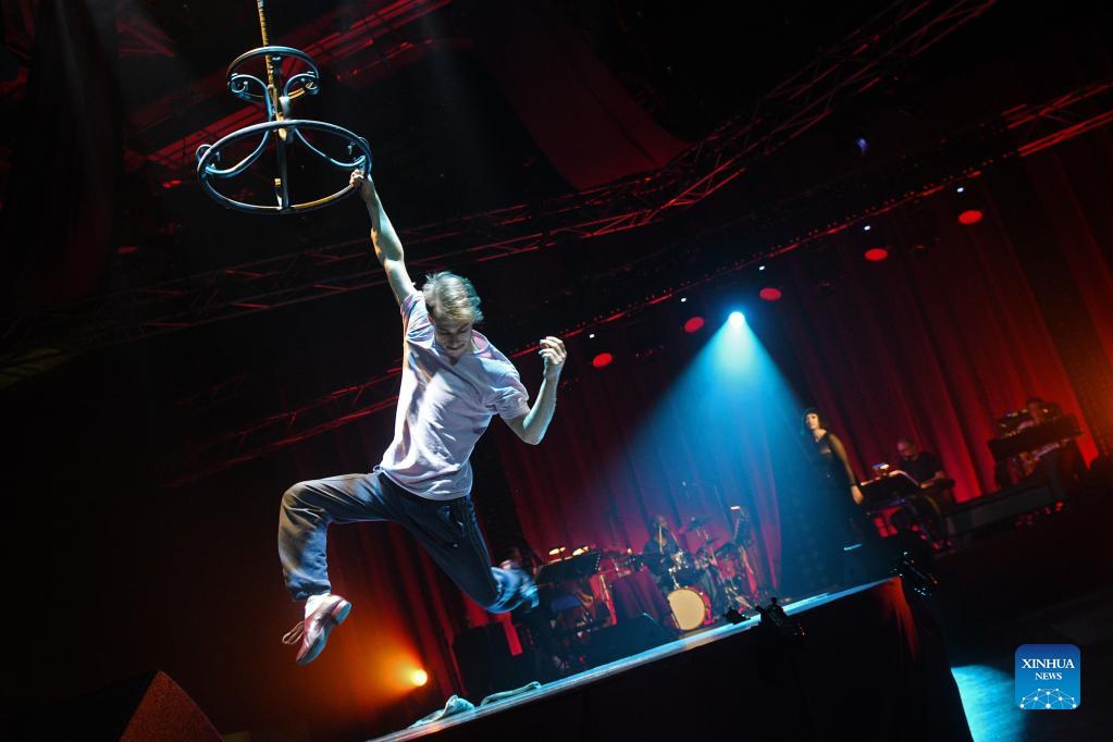 An artist performs during a rehearsal for "La Clique" circus cabaret show at Singapore's Marina Bay Sand convention hall on Sept. 17, 2021. (Photo by Then Chih Wey/Xinhua)