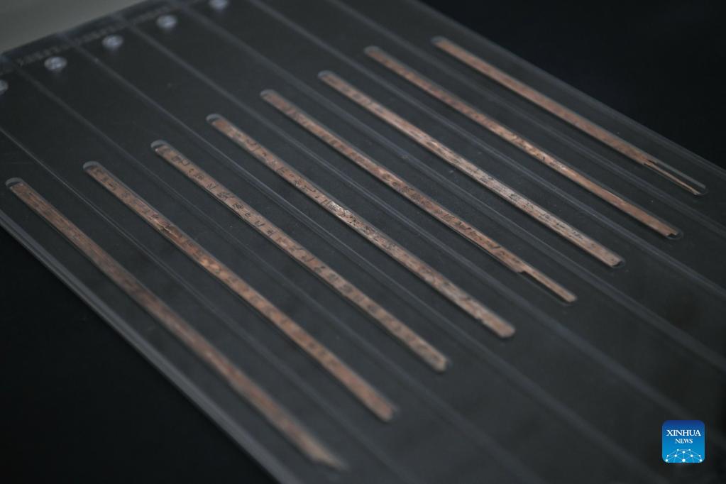 Photo taken on Sept. 17, 2021 shows bamboo slips on pathology displayed during an exhibition featuring traditional Chinese medicine relics in Chengdu Museum in Chengdu, capital of southwest China's Sichuan Province. The exhibition, which kicked off here on Friday, showcases more than 300 traditional Chinese medicine-related relics. (Xinhua/Xu Bingjie)
