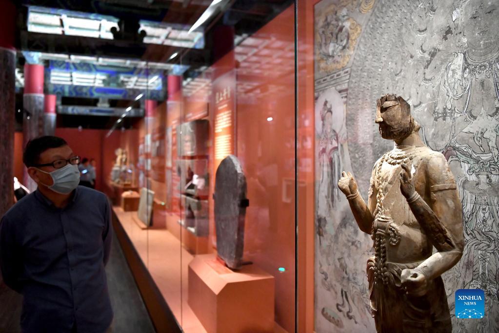 A visitor looks at an exhibit at an exhibition themed on Dunhuang culture at the Palace Museum, also known as the Forbidden City, in Beijing, capital of China, Sept. 17, 2021. (Xinhua/Li Xin)