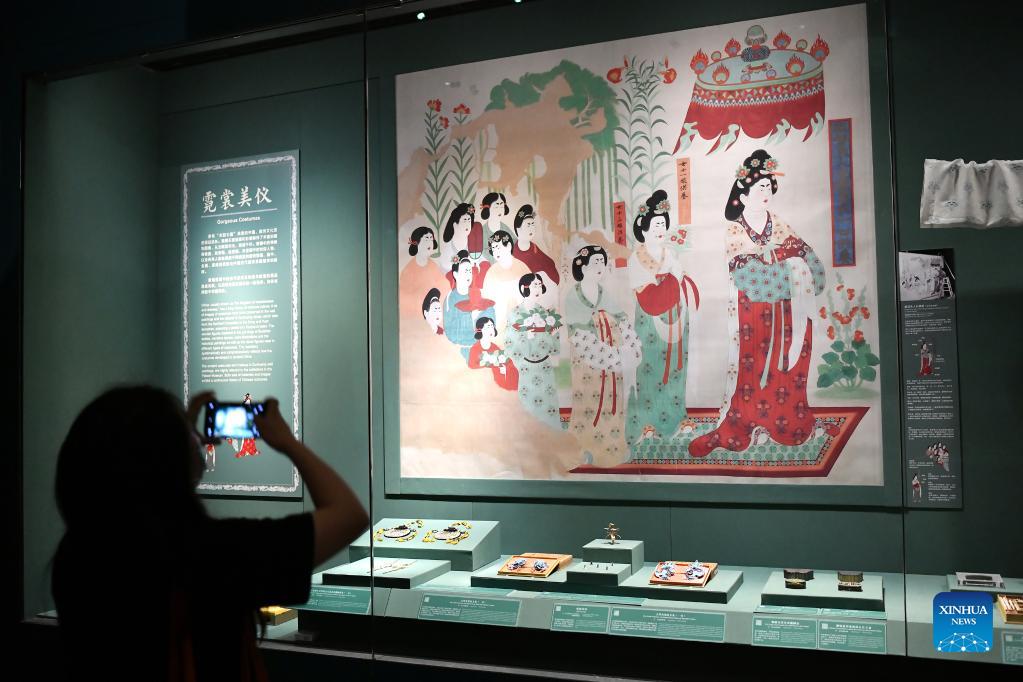 A visitor takes photos of exhibits at an exhibition themed on Dunhuang culture at the Palace Museum, also known as the Forbidden City, in Beijing, capital of China, Sept. 17, 2021. (Xinhua/Li Xin)