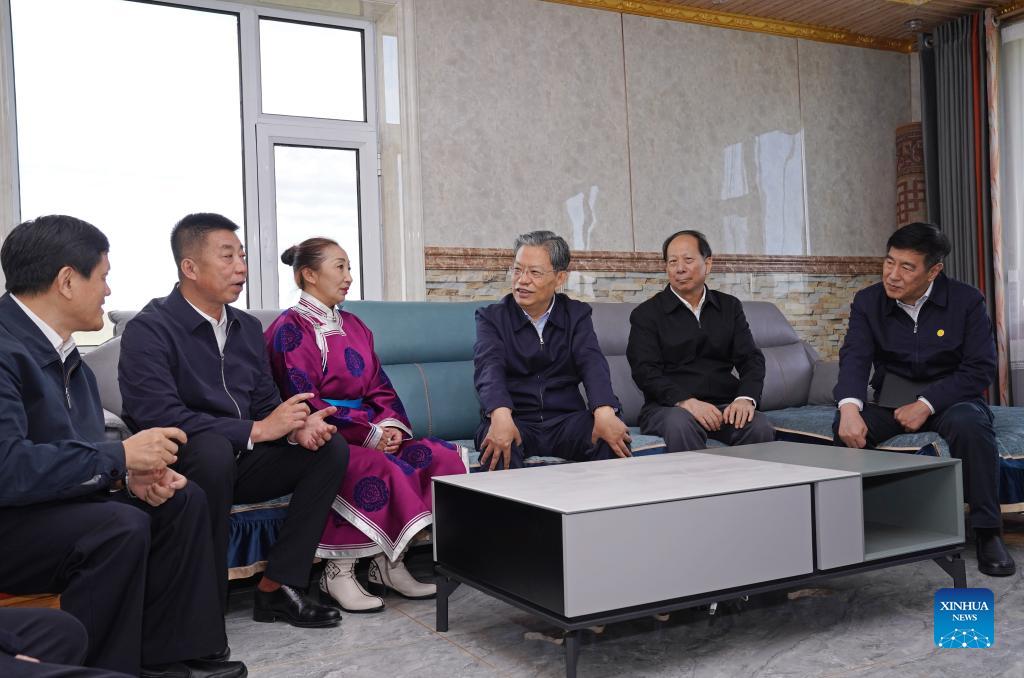 Zhao Leji, a member of the Standing Committee of the Political Bureau of the Communist Party of China (CPC) Central Committee and secretary of the CPC Central Commission for Discipline Inspection, visits a local herdsman's household at a village in Hulun Buir, north China's Inner Mongolia Autonomous Region, Sept. 16, 2021. Zhao made an inspection tour to Inner Mongolia Autonomous Region from Wednesday to Friday. (Xinhua/Zhang Ling)