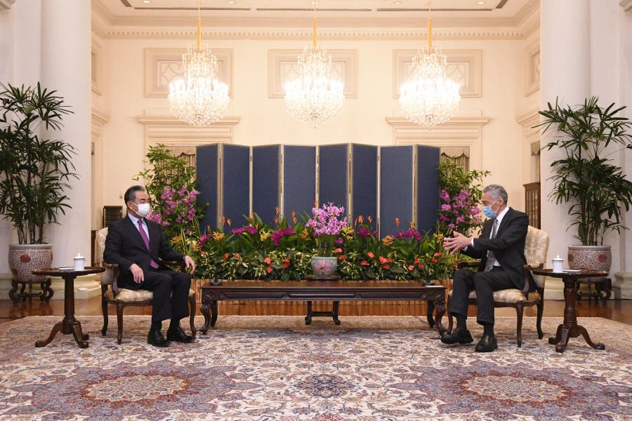 Singaporean Prime Minister Lee Hsien Loong meets with visiting Chinese State Councilor and Foreign Minister Wang Yi in Singapore, Sept. 14, 2021. (Photo by Then Chih Wey/Xinhua)