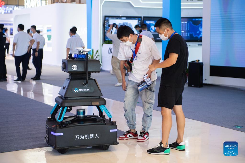 Visitors interact with a robot at the 2021 World Computing Conference in Changsha, central China's Hunan Province, Sept. 17, 2021. (Xinhua/Chen Sihan)
