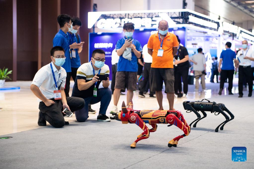 Visitors watch a robot dog and a robot ox at the 2021 World Computing Conference in Changsha, central China's Hunan Province, Sept. 17, 2021. (Xinhua/Chen Sihan)