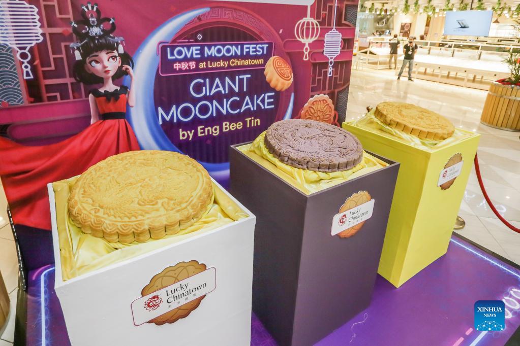 Giant mooncakes are displayed in celebration of the Mid-Autumn Festival at a mall in Chinatown in Manila, the Philippines, Sept. 17, 2021. (Xinhua/Rouelle Umali)