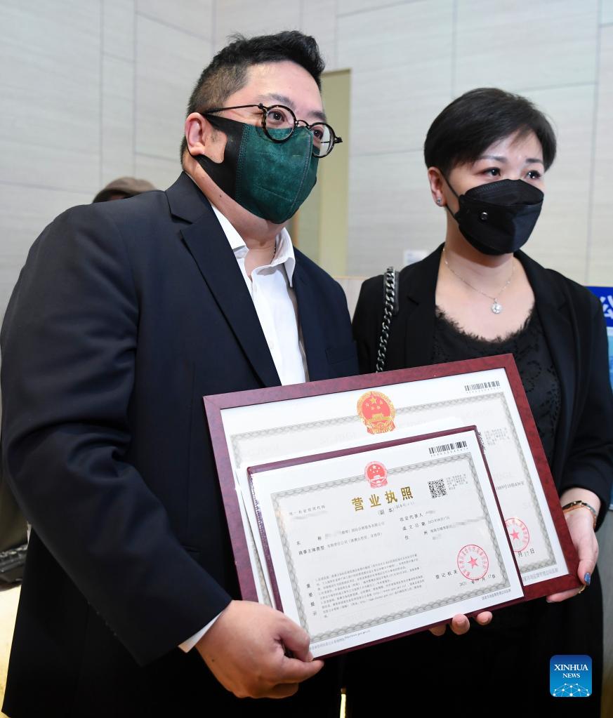 Company representatives obtain business license at the integrated services center of Guangdong-Macao In-depth Cooperation Zone in Hengqin, in Zhuhai City, south China's Guangdong Province, Sept. 17, 2021. Administrative organizations of the Guangdong-Macao In-depth Cooperation Zone in Hengqin were inaugurated on Friday. On Sept. 5, China's central authorities issued a general plan for building a Guangdong-Macao in-depth cooperation zone in Hengqin, which is located in the southern part of Zhuhai City in Guangdong Province, just across the Macao Special Administrative Region. (Xinhua/Deng Hua)