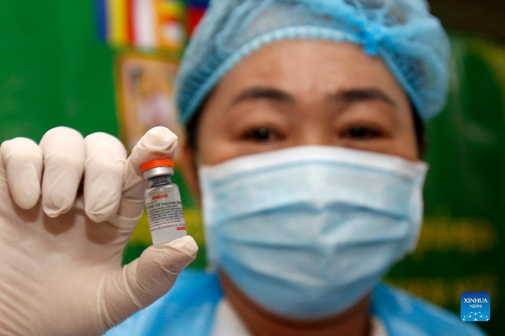 A medical worker shows a dose of COVID-19 vaccine at an inoculation site in Phnom Penh, Cambodia on Sept. 17, 2021. A COVID-19 vaccination drive for children from 6 to 12 years old began nationwide on Friday. (Photo by Sovannara/Xinhua)