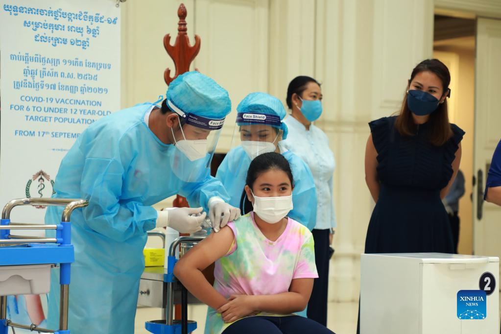 A girl receives a dose of COVID-19 vaccine at an inoculation site in Phnom Penh, Cambodia on Sept. 17, 2021. A COVID-19 vaccination drive for children from 6 to 12 years old began nationwide on Friday. (Photo by Sovannara/Xinhua)