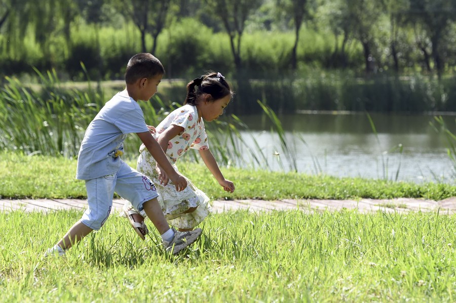 Children play at Xinghuagou wetland park transformed from the mining subsidence area of Jingxing in Shijiazhuang, north China's Hebei Province, Aug. 24, 2021. (Xinhua/Luo Xuefeng)