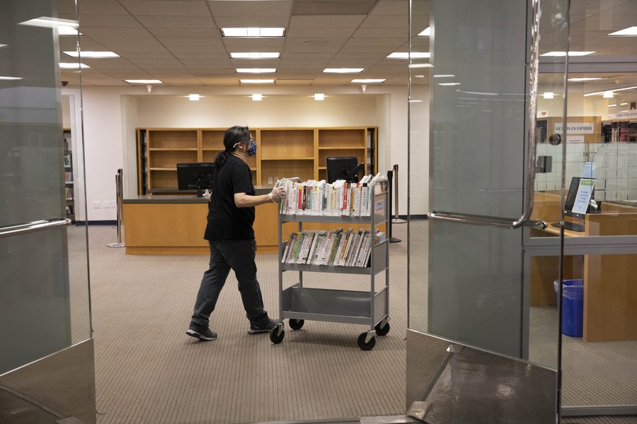 A staff member works at the San Francisco Public Library in San Francisco, the United States, May 3, 2021. (Photo by Li Jianguo/Xinhua)