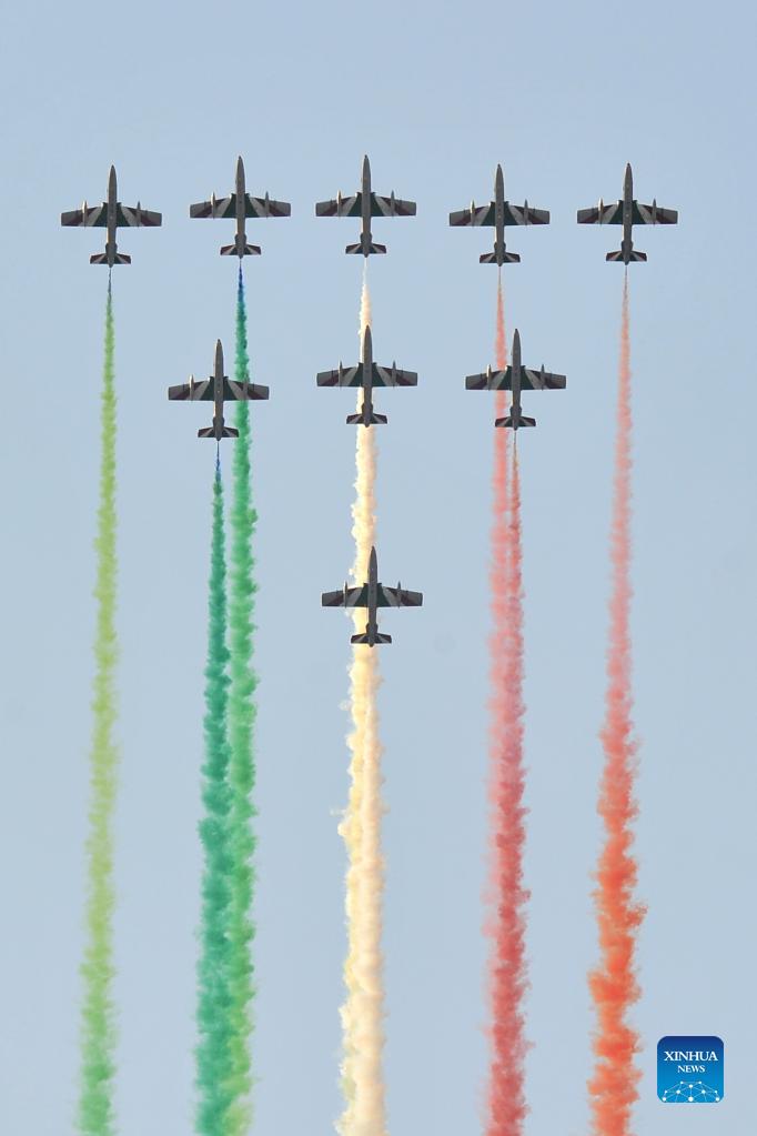 The Italian Frecce Tricolori aerobatic squad performs during an airshow in Rivolto, Italy, on Sept. 18, 2021. The Italian Air Force held the airshow to mark the 60th anniversary of the Frecce Tricolori here on Saturday. (Str/Xinhua)