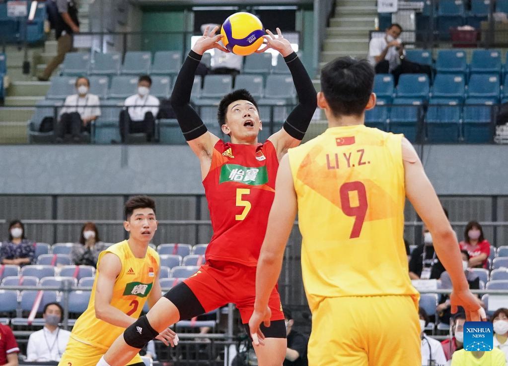 Yang Yiming (C) of China passes the ball during the semi-final against Iran at the 21st Asian Senior Men's Volleyball Championship in Chiba, Japan on Sept. 18, 2021. (Photo by Christopher Jue/Xinhua)