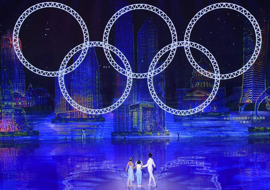 Photo taken on Sept. 8, 2017 shows the Olympic rings at the closing ceremony of the 13th Chinese National Games in Tianjin. (Xinhua/Yue Yuewei)
