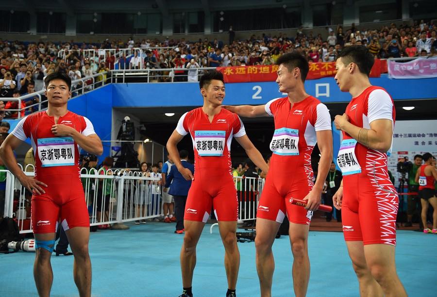 Su Bingtian, Xie Zhenye, Zhang Peimeng and Wu Zhiqiang (from L to R) of the joint team of Beijing, Zhejiang, Hubei and Guangdong completed their men's 4x100m relay final at the 13th Chinese National Games in Tianjin, Sept. 7, 2017. (Xinhua/Xu Chang)