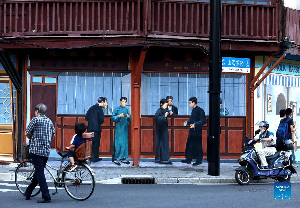 People pass by a wall painting depicting life in small alley in old residential area of Shanghai, east China, Sept. 19, 2021. (Xinhua/Chen Fei)