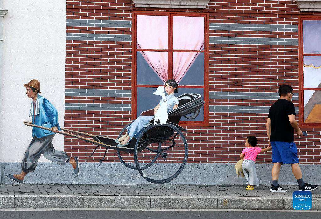 People pass by a wall painting depicting life in small alley in old residential area of Shanghai, east China, Sept. 19, 2021. (Xinhua/Chen Fei)