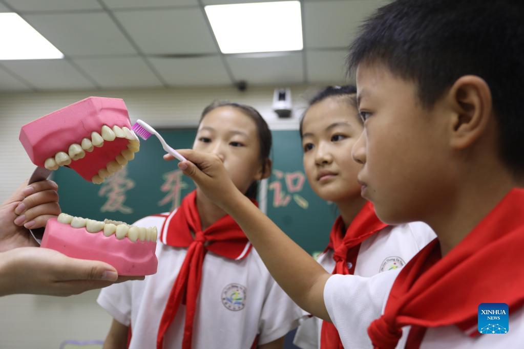 Students learn the right way to brush teeth at a school in Lincheng County of Xingtai City, north China's Hebei Province, Sept. 18, 2021. China's Dental Care Day falls on Sept. 20. (Xinhua/Luo Xuefeng)