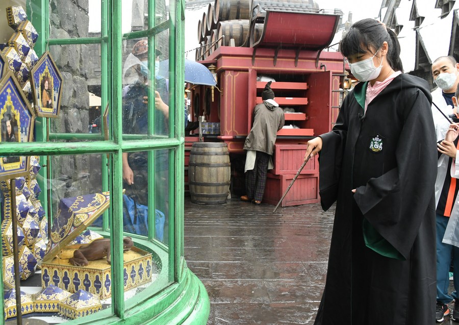 Tourists visit the Wizarding World of Harry Potter at the Universal Beijing Resort in Beijing, capital of China, Sept. 20, 2021. The Universal Beijing Resort, currently the largest in scale worldwide, opened to the public on Monday. (Xinhua/Ren Chao)