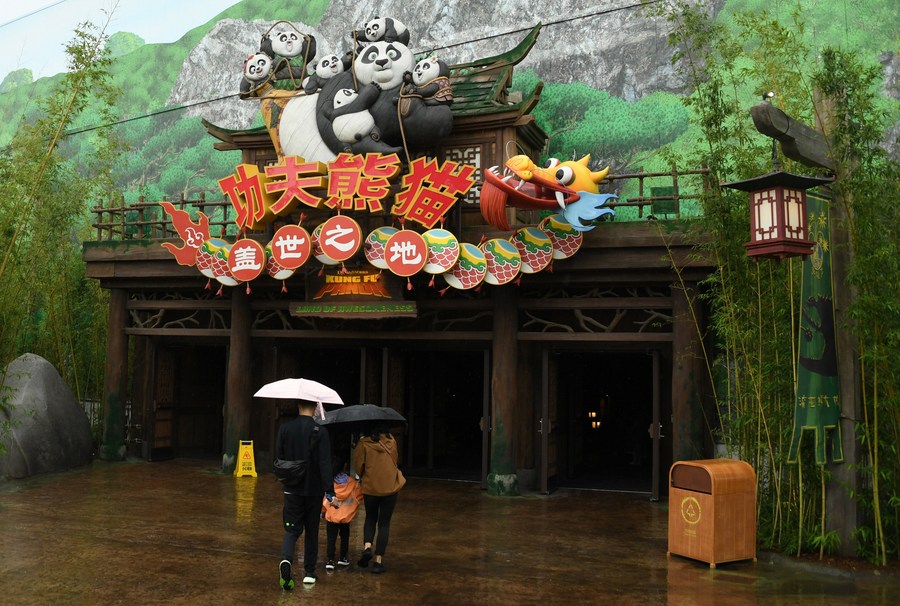 Tourists visit Kung Fu Panda Land of Awesomeness at the Universal Beijing Resort in Beijing, capital of China, Sept. 20, 2021. The Universal Beijing Resort, currently the largest in scale worldwide, opened to the public on Monday. (Xinhua/Ren Chao)