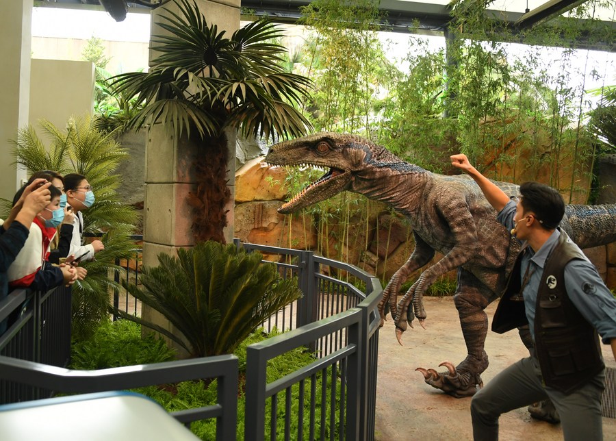 Tourists visit the theme land of Jurassic World Isla Nublar at the Universal Beijing Resort in Beijing, capital of China, Sept. 20, 2021. The Universal Beijing Resort, currently the largest in scale worldwide, opened to the public on Monday. (Xinhua/Ren Chao)