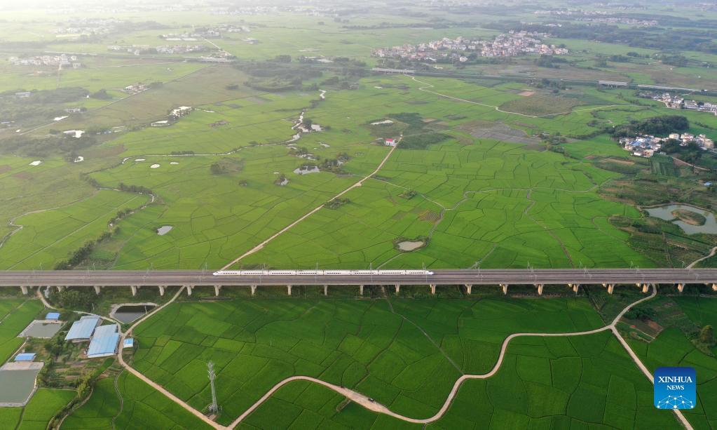 Aerial photo taken on Sept. 19, 2021 shows a bullet train running above paddy fields in Gula Township, Binyang County, south China's Guangxi Zhuang Autonomous Region. (Xinhua/Huang Xiaobang)