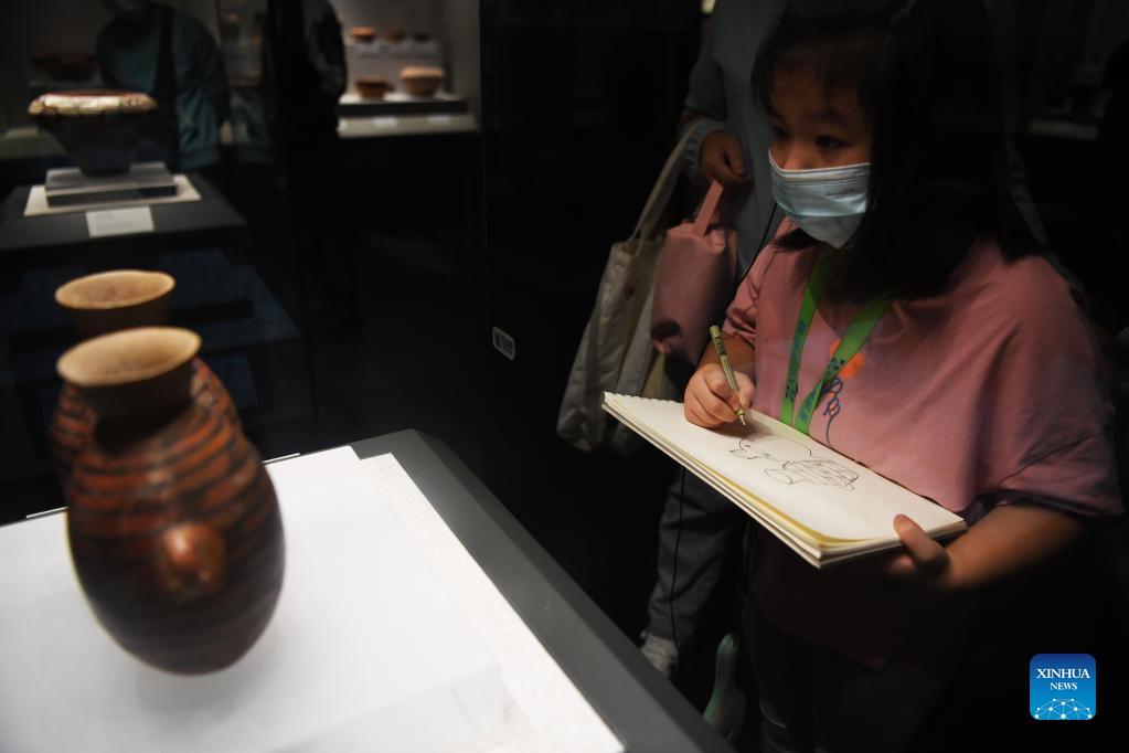 A girl draws exhibits displayed at Henan Museum in Zhengzhou, central China's Henan Province, Sept. 20, 2021. Many people visited the museum during the Mid-Autumn Festival holiday. (Xinhua/Zhang Haoran)