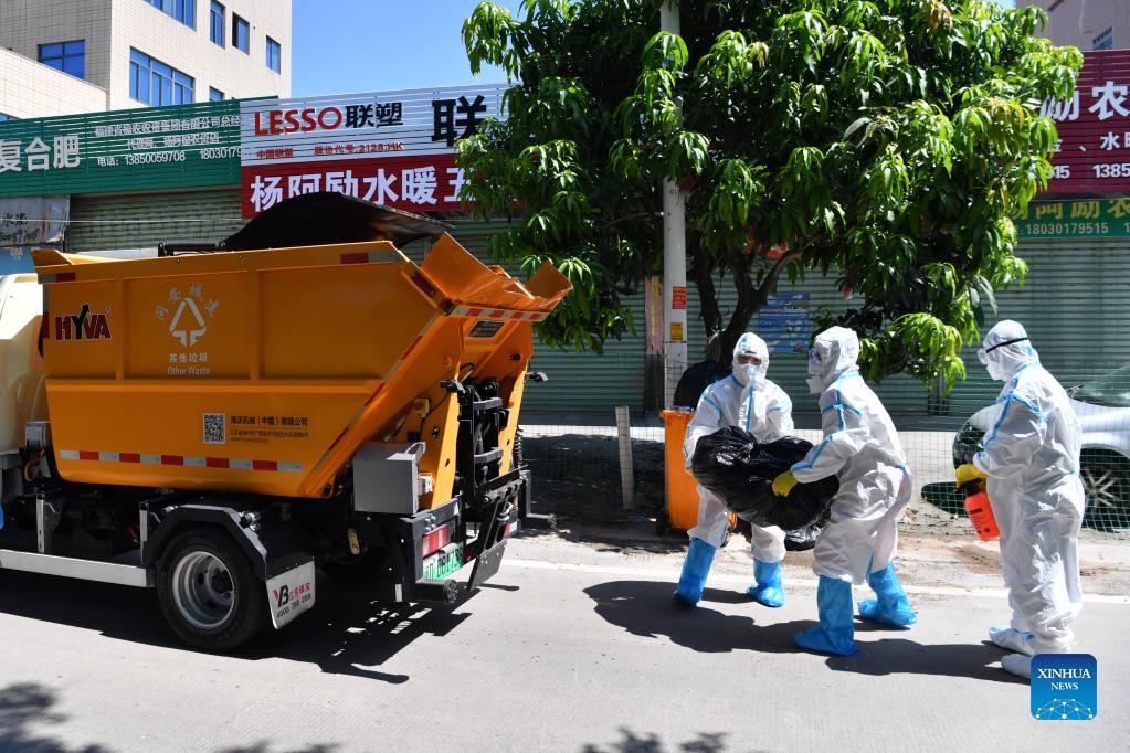 Staff members transfer garbage bags at Xintang Village, Xinmin Township, Tongan District of Xiamen City, southeast China's Fujian Province, Sept. 20, 2021. Experts under the State Council inter-agency task force for COVID-19 response have arrived at high and medium COVID-19 risk areas in Tongan on Monday to guide local epidemic prevention and control. (Xinhua/Jiang Kehong)