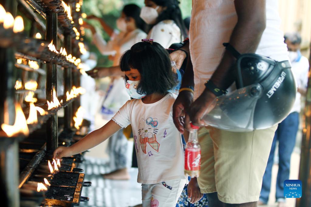 A girl offers prayers during the Poya Day in the Kelaniya Temple in Kelaniya, Sri Lanka, Sept. 20, 2021. Poya day is a monthly holiday in Sri Lanka, marking the full moon. (Photo by Ajith Perera/Xinhua)